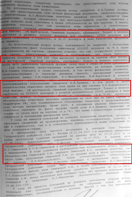 Скандал, который касается сразу трех известных фамилий — Семенова, Кончаловского, Михалкова, может приобрести мировой резонанс. 28 картин знаменитого художника Петра Кончаловского оказались вывезенными за границу, на что Министерство культуры разрешения не давало. Некоторые полотна, средняя цена которых переваливает за $20 млн., были обнаружены представляющим интересы вдовы писателя Екатерины Семеновой адвокатом Дмитрием Опариным на аукционах Англии и Франции. Как уверяет наследница полотен Екатерина Семенова, она не то что не давала согласия на вывоз картин, но и вообще не понимает, почему ее дочь Ольга Юлиановна распорядилась ими по своему усмотрению.