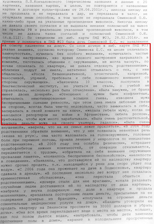 Дочь писателя Юлиана СЕМЕНОВА Ольга оспаривает решение Гагаринского районного суда города Москвы, пытаясь доказать, что ее мать Екатерина СЕМЕНОВА психически нездорова. По мнению Ольги, родительница не пускает родных на порог, незаконно распоряжается своей имущественной долей, а главное, раздаривает наследство деда — художника Петра КОНЧАЛОВСКОГО. «Экспресс газета» провела собственное расследование и выяснила, почему 84-летняя Екатерина Семенова, имея две квартиры и право проживания в загородном доме, почти год находится в больнице города Троицка.