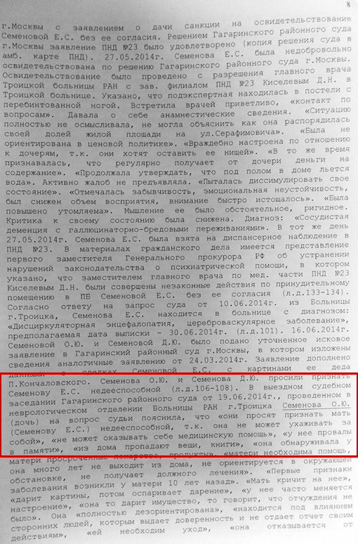 Как следует из материалов дела, Екатерину Семенову в больницу насильно увезла платная бригада психиатрической помощи, которую вызвала дочь Ольга.